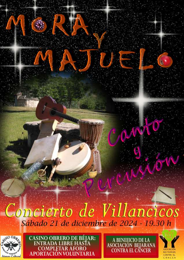 El grupo de canto y percusión Mora y Majuelo ofrece el sábado, 21 de diciembre, a partir de las 19:30h un concierto benéfico en el Casino Obrero de Béjar en favor de la Asociación Bejarana Contra el Cáncer.