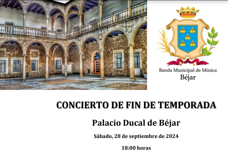 El sábado, 28 de agosto, la Banda Municipal de Música de Béjar ofrecerá su último concierto de temporada en el Palacio Ducal de Béjar a las 18:00 horas.