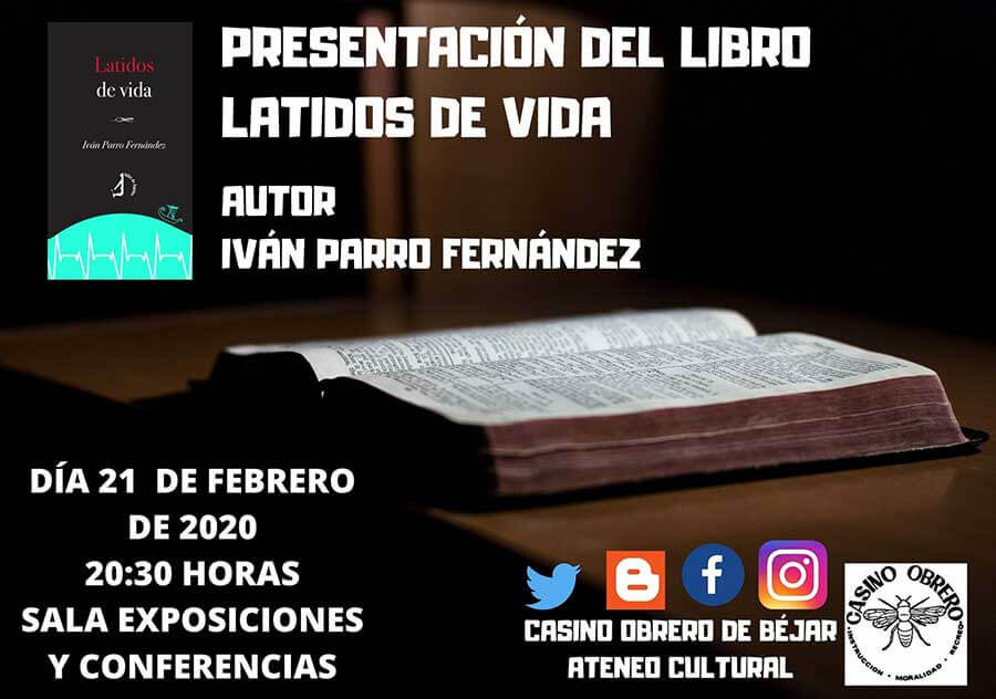 El Casino Obrero de Béjar acoge el viernes, 21 de febrero, a las 20:30 horas la presentación del libro "latidos de vida" del autor Iván Parro Fernández.