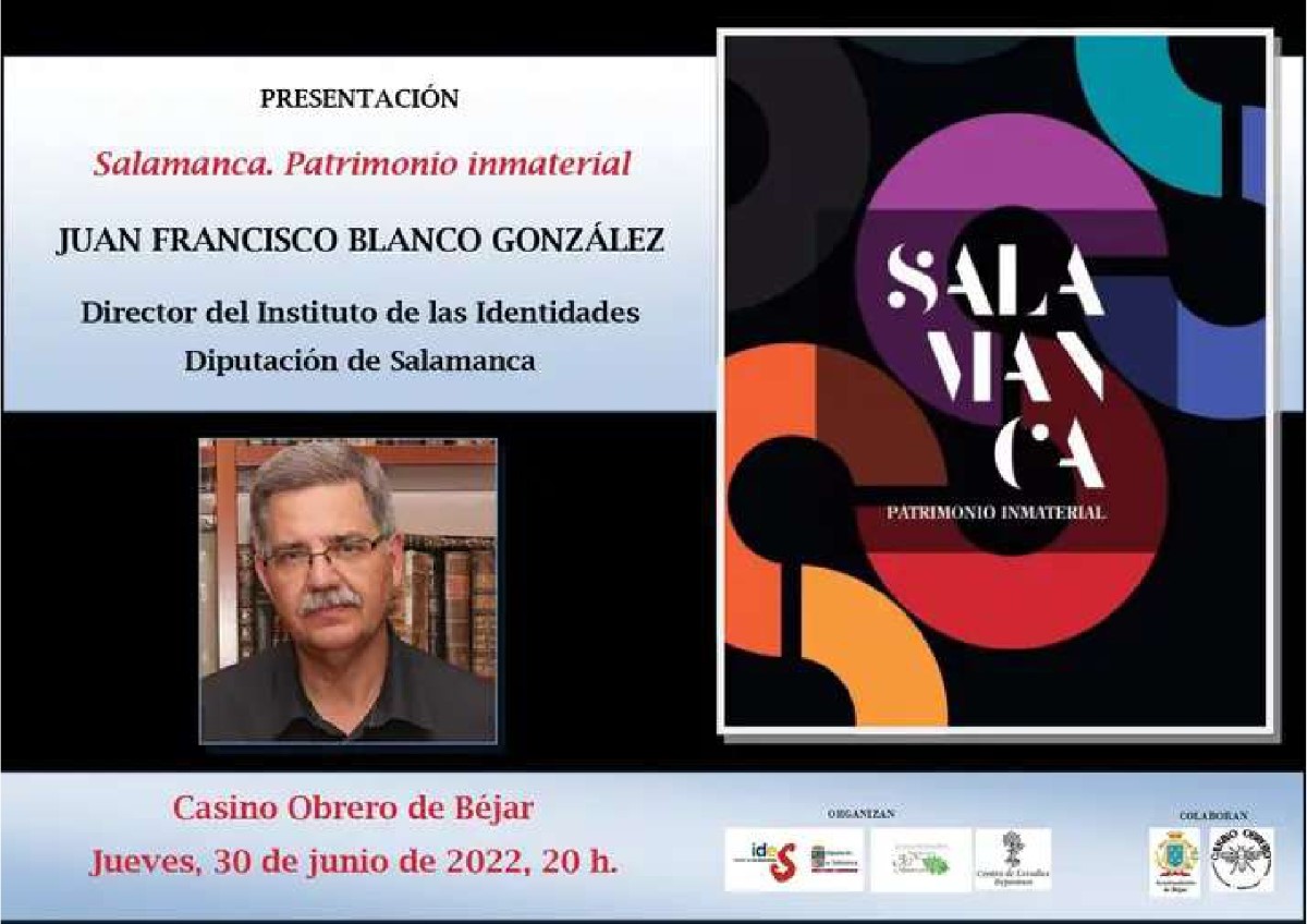 El próximo jueves día 30 de Junio a las 20:00 horas, tendrá lugar en la sala de exposiciones y conferencias del Ateneo Cultural Casino Obrero de Béjar la presentación del libro "Salamanca. Patrimonio inmaterial", de Juan Francisco Blanco González director del Instituto de las Identidades de la Diputación de Salamanca.