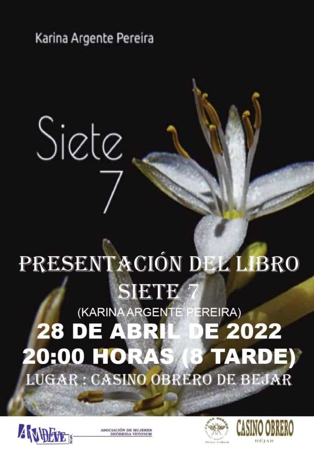 Karina Argente Pereira presenta en Béjar su libro "Siete 7". Será el jueves, 28 de abril, en el Casino Obrero de Béjar a partir de las 20h.