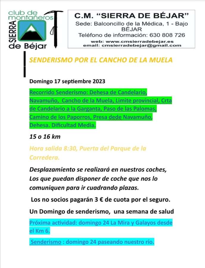 El Club de Montañeros Sierra de Béjar organiza el domingo, 17 de septiembre, una ruta de senderismo desde la Dehesa de Candelario hasta el Cancho La Muela. La actividad, con un recorrido de 15-16 km, está catalogada como de dificultad media.