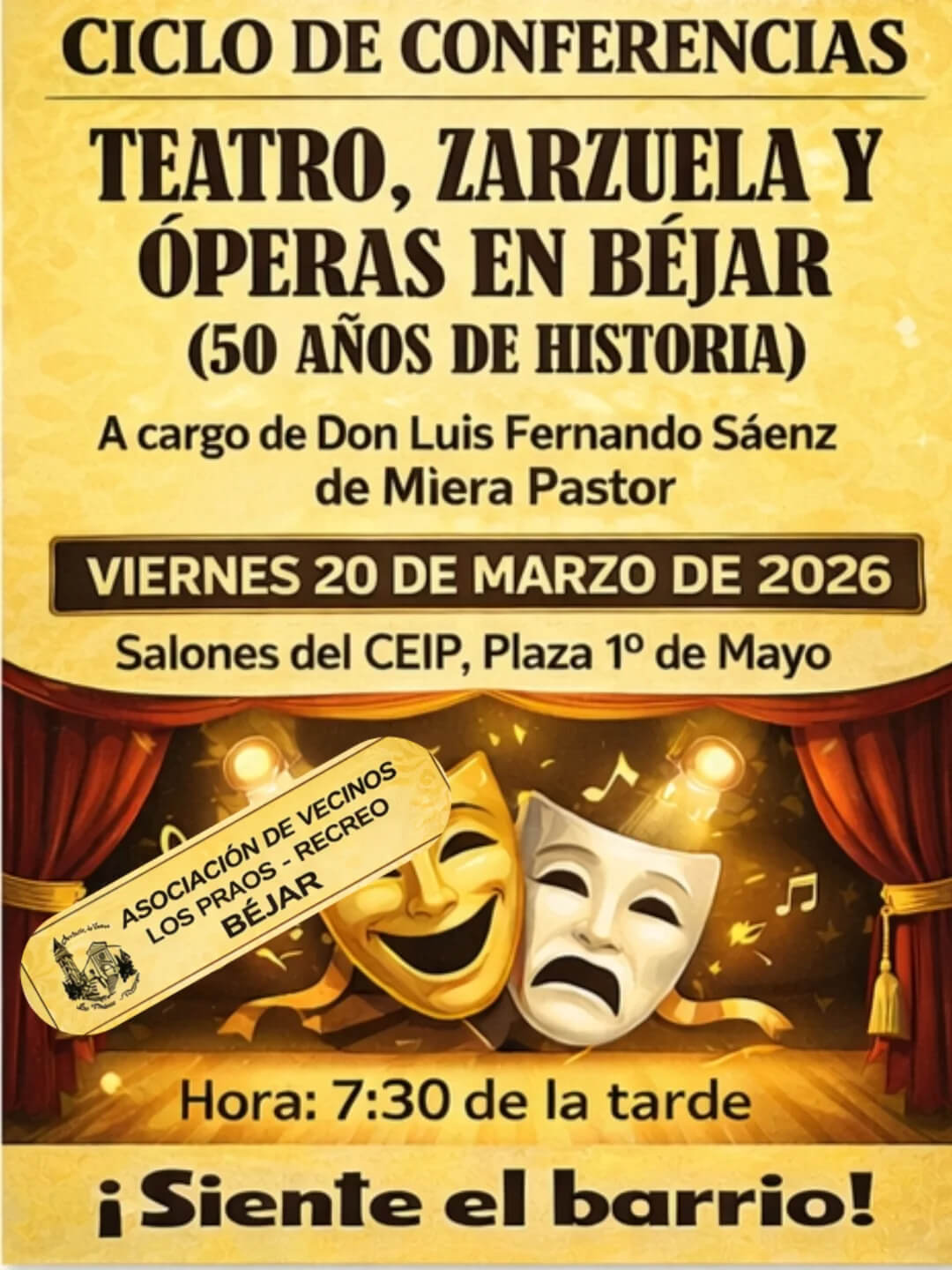 La Asociación de Vecinos Los Praos-Recreo de Béjar organiza una nueva sesión del ciclo de conferencias “Teatro, zarzuela y óperas en Béjar (50 años de historia)”, que será impartida por Luis Fernando Sáenz de Miera Pastor.