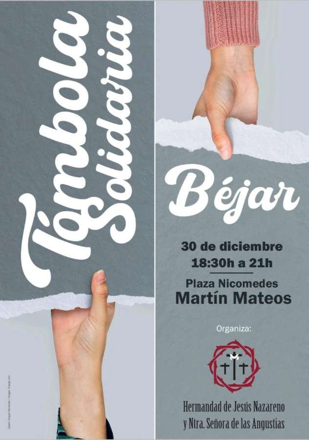 La Hermandad de Jesús Nazareno y Nuestra Señora de las Angustias celebra el viernes 30 de diciembre desde las 18.30h una tómbola solidaria en la plaza de Nicomedes Martín Mateos de Béjar (junto al Museo Mateo Hernández).
