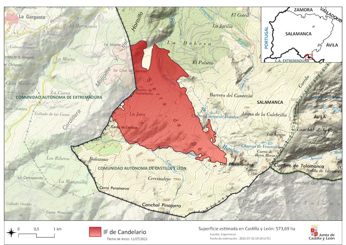 Los datos del sistema de satélites europeos, Copernicus, revelan de forma bastante aproximada la superficie quemada en el Incendio de Candelario, un total de 563,79 hectáreas. El fuego, que se dio por totalmente controlado el pasado 30 de junio, se ha saldado con una gran y valiosa superficie de sierra que pereció pasto de las llamas.