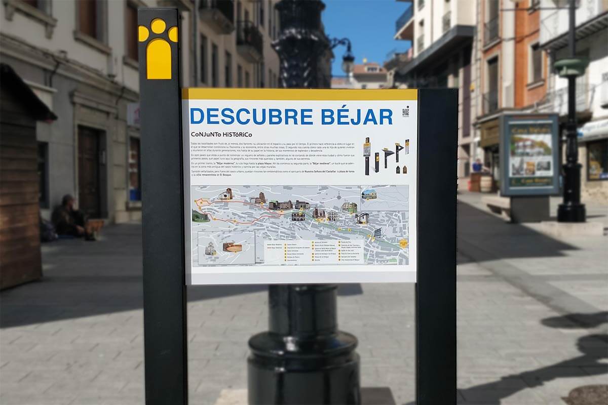 La ruta comienza en la Plaza de España y continúa por la calle Mayor hasta llegar a la plaza Mayor, una zona en la que hay una mayor profusión de carteles debido a la gran cantidad de lugares de interés que existen en la que es la principal arteria del casco histórico. El segundo tramo señalizado va desde la plaza Mayor hasta la muralla por la calle 29 de Agosto, donde se encuentra la parte más antigua de la ciudad, y la tercera señalización se ha colocado en el paseo de la muralla, marcando la ruta circular con vuelta de nuevo hasta la plaza Mayor. Además, también se han colocado paneles informativos en el Convento de San Francisco, El Bosque, la Plaza de Toros, Iglesia de San Juan y Santuario de Nuestra Sra. del Castañar.