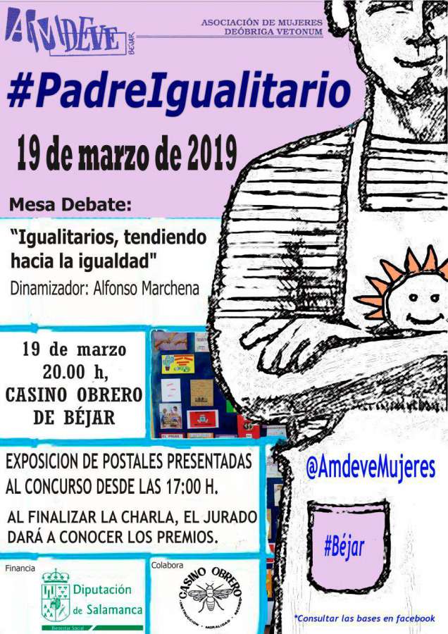 Con motivo del Día del Padre Igualitario, el próximo martes 19 de marzo, AMDEVE organiza una charla en el Casino Obrero de Béjar bajo el título "Igualitarios, tendiendo hacia la igualdad". Será impartida por el dinamizador, Alfonso Marchena a partir de las ocho de la tarde.