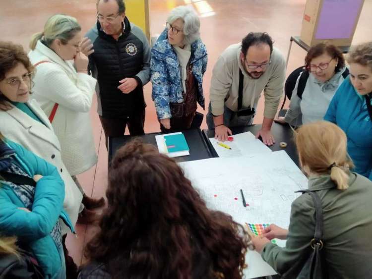 Durante la mañana, los asistentes pudieron compartir recuerdos, propuestas y necesidades de la zona en un ambiente distendido y participativo. Uno de los elementos clave de la jornada fue un gran mapa del barrio, sobre el que los participantes marcaron diferentes puntos de interés y problemáticas a abordar.