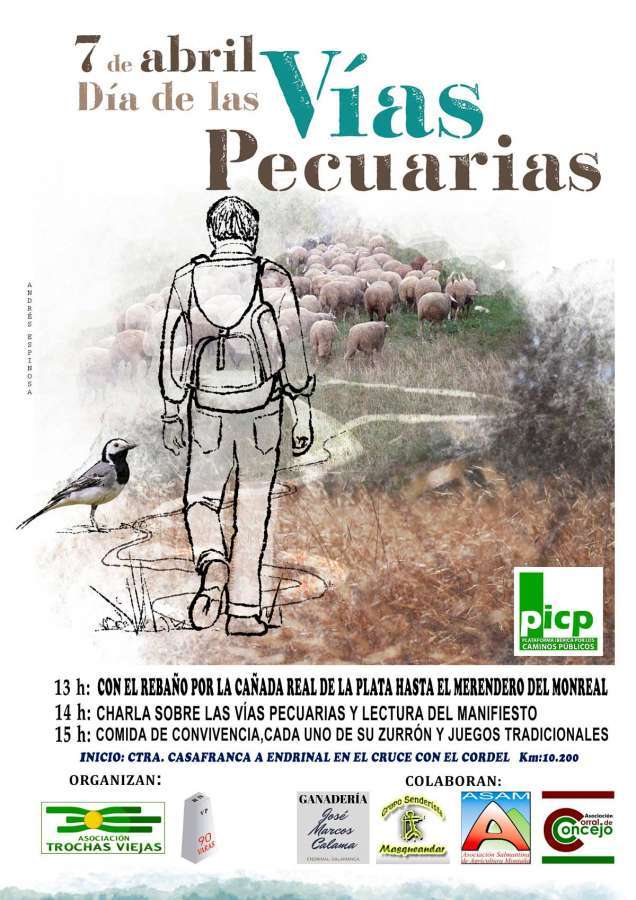 La asociación Trochas Viejas y ARIC "90 varas" con la colaboración del Grupo Senderista Masqueandar, la Asociación Salmantina de Agricultura de Montaña, la Asociación cultural “El Corral del Concejo y la ganadería de José Marcos Calama celebran el 7 de abril el Día de las Vías Pecuarias en Casafranca (Salamanca).