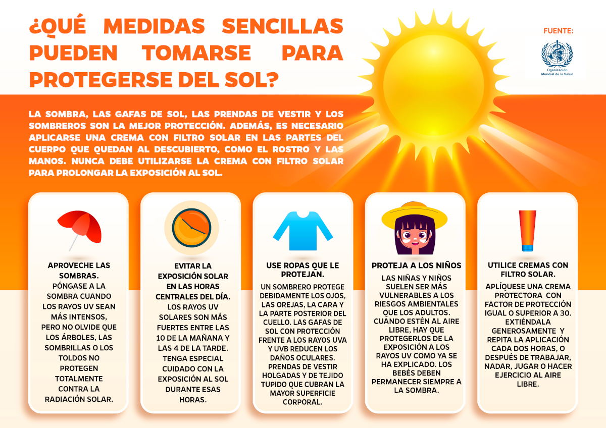 La OMS recomienda una serie de pequeñas medidas para protegerse de la exposición excesiva a las radiaciones ultravioleta que se han plasmado en un divertido folleto y cartel que estará disponible en la Piscina Municipal de Béjar, en farmacias y tiendas de venta de protectores solares.