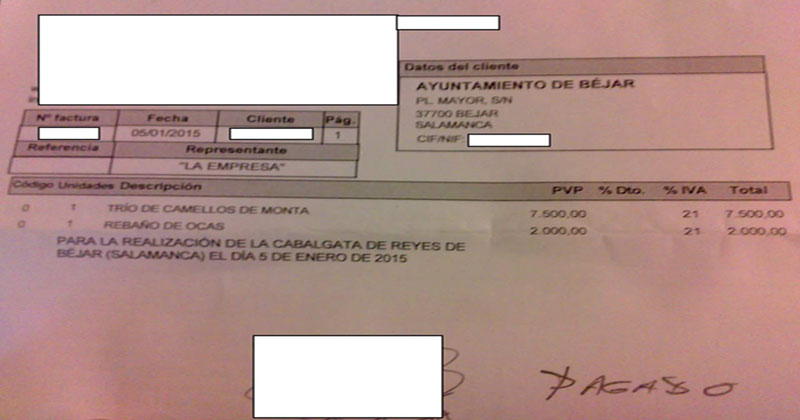 El montante total de la factura asciende a 9.500 euros más IVA . El trio de camellos se desglosa en 7.500 €, a razón de 2.500 euros la unidad, y el rebaño de ocas que desfiló por las calles bejaranas, durante la cabalgata de Reyes, 2000 euros.