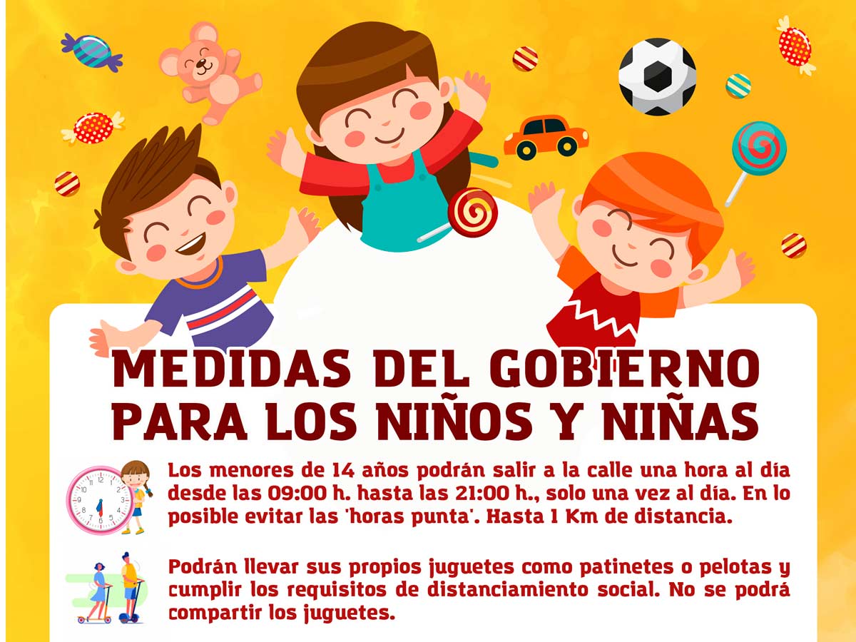 - Los menores de 14 años podrán salir a la calle una hora al día desde las 09:00 h. hasta las 21:00 h., solo una vez al día.