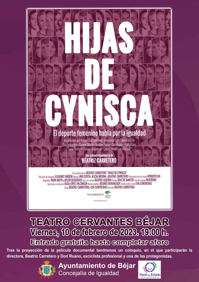 La primera de ellas será el próximo 10 de febrero, viernes con la proyección del documental Hijas de Cynisca, (El deporte femenino habla por la igualdad). Concretamente van a ser dos las proyecciones y ambas en el Teatro Cervantes. La primera de ellas, en horario de mañana, está destinada al alumnado de secundaria y bachillerato de los centros educativos de la ciudad. La segunda proyección será a las 19:00 h y estará abierta a todo el público que quiera asistir, con entrada libre hasta completar aforo.