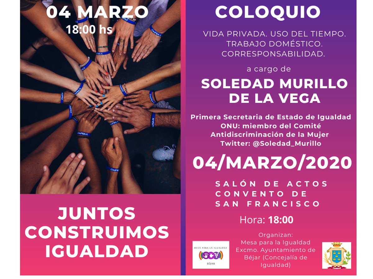 - El miércoles, 4 de marzo, a las 18:00 h tendrá lugar un coloquio con Soledad Murillo de la Vega, Primera Secretaria del Estado de Igualdad, en el salón de actos del C.M.C. San Francisco.