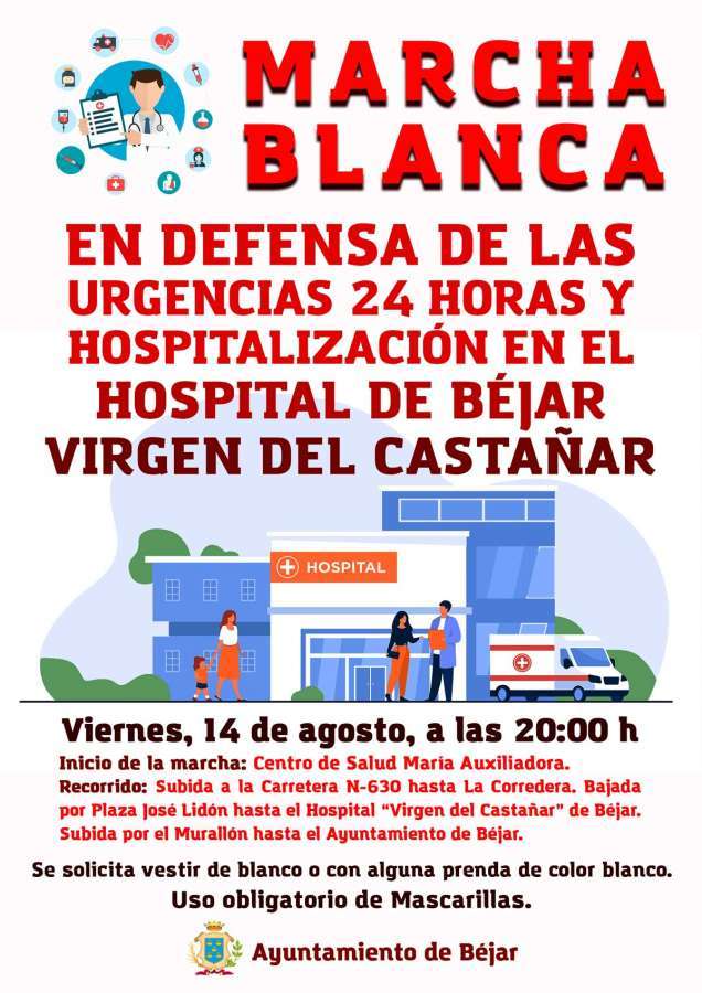 Por ello, el Ayuntamiento de Béjar realizará varias medidas de prensión, entre ellas la convocatoria de esta Marcha Blanca, el viernes, 14 de agosto que comenzará su recorrido a las 20:00 horas en el Centro de Salud María Auxiliadora, continuará por la carretera N-630 hasta La Corredera, bajará por la Plaza José Lidón hasta el Hospital Virgen del Castañar, se subirá por el Murallón hasta el Ayuntamiento de Béjar donde se realizará una lectura de un manifiesto en apoyo al funcionamiento del hospital antes de la crisis sanitaria.