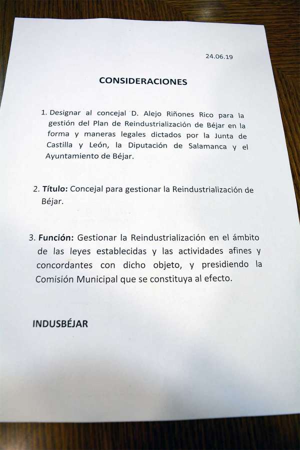 En un principio el representante de la empresa IndusBéjar, indicó que no había ningún condicionante político para la instalación de las empresas en la ciudad, según fuentes municipales, al término de ésta presentó un documento con unas condiciones en las que se indicaba que Alejo Riñones fuese el encargado de la gestión del Plan de Reindustrialización, como condición para seguir adelante con los planes.