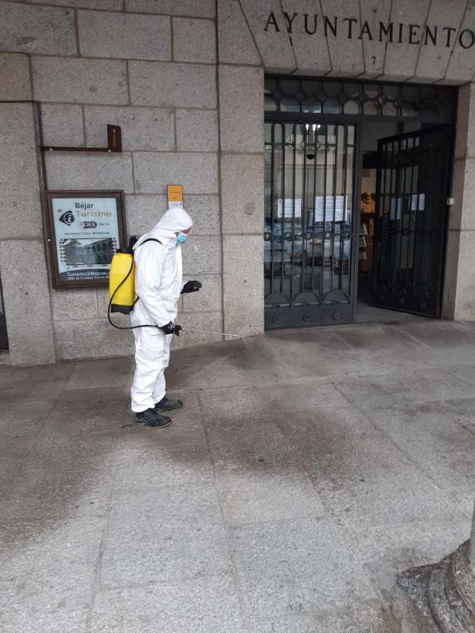 Trabajadores del área de Medio ambiente del Ayuntamiento de Béjar han iniciado las labores de desinfección de las calles y mobiliario urbano de la ciudad y pedanías.