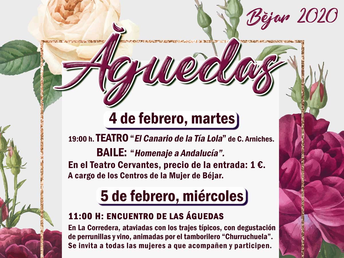 El martes, 4 de febrero, a las 19:00 h. se representará la obra de teatro "El Canario de la Tía Lola" de C. Arniches y el baile "Homenaje a Andalucía" a cargo de los Centros de la Mujer de Béjar. Este año tendrá lugar en el Teatro Cervantes por el precio de un euro la entrada.