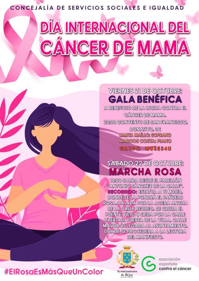 El viernes, 21 de octubre a las 20:00 horas se realizará la Gala Benéfica en el Salón de Actos del Convento San Francisco con la actuación del Grupo Muses4U, a beneficio de la lucha contra el cáncer de mama con un donativo de 3€. La compra de entradas se podrá realizar en todos los establecimientos que tengan en sus escaparates un punto rosa. También se dispondrá de fila cero, para todas aquellas personas que quieran colaborar, pero no puedan asistir a la gala.