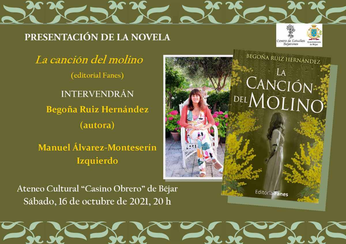 La próxima actividad del programa “Otoño entre libros”, organizado por el Centro de Estudios Bejaranos, será la presentación de la novela de Begoña Ruiz Hernández, "La canción del molino", de la editorial Fanes.
