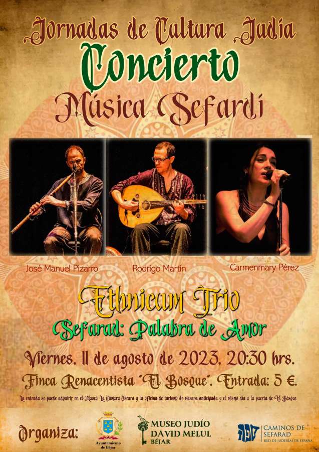 El viernes, 11 de agosto, las jornadas culminarán con un espectacular concierto a cargo del grupo Ethnicam Trío. Bajo el título "Sefarad: palabra de Amor", el trío deleitará a los asistentes con una fusión de melodías sefardíes y ritmos contemporáneos. El evento tendrá lugar a partir de las 20:30 horas en la Finca Renacentista "El Bosque", un entorno encantador que realzará la experiencia musical. El acceso al concierto tendrá un costo de cinco euros por persona y las entradas podrán adquirirse de forma anticipada en el Museo David Melul, La Cámara Oscura y la Oficina de Turismo de Béjar. También se venderán entradas en la puerta de "El Bosque" el mismo día del concierto.