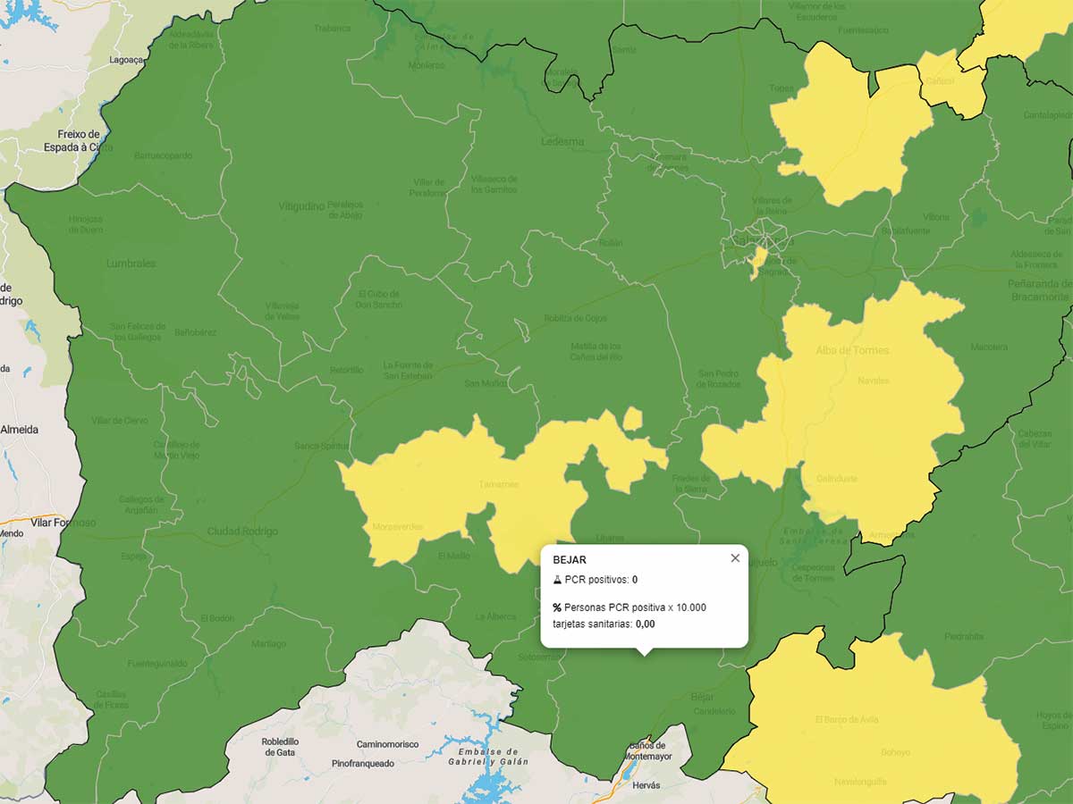 Los datos en la zona de salud de Béjar han mejorado mucho en la última semana, hasta el punto de que en los último 7 días no se ha registrado ningún nuevo caso positivos confirmados por PCR, manteniéndose la cifra de 118 positivos confirmados de un total de 618 test PCR realizados. Según datos de la Junta de Castilla y León, todavía existen 82 casos activos.