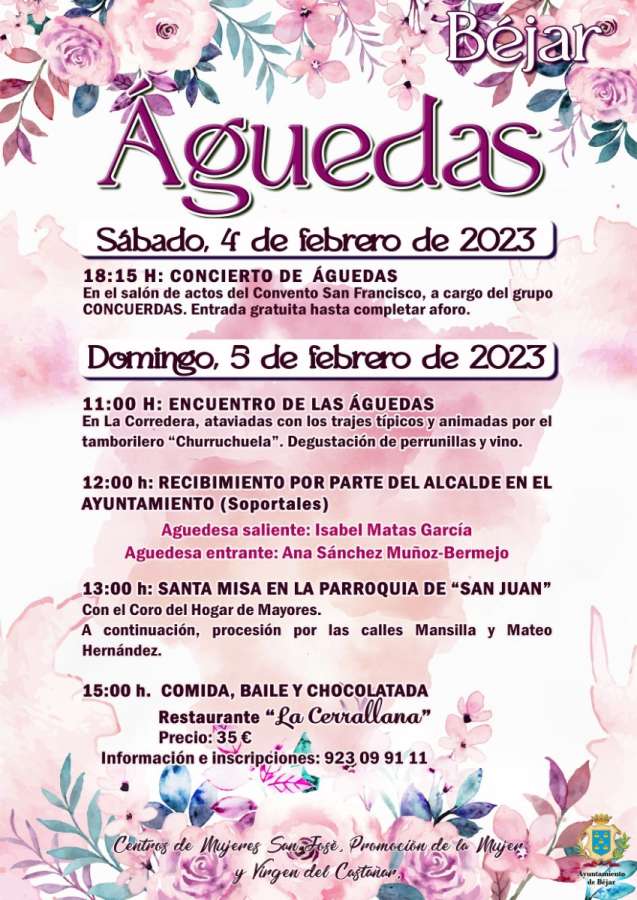 12:00 h: Recibimiento por parte del alcalde en el ayuntamiento de Béjar. Aguedesa saliente: Isabel Matas García; Aguedesa entrante: Ana Sánchez Muñoz-Bermejo.