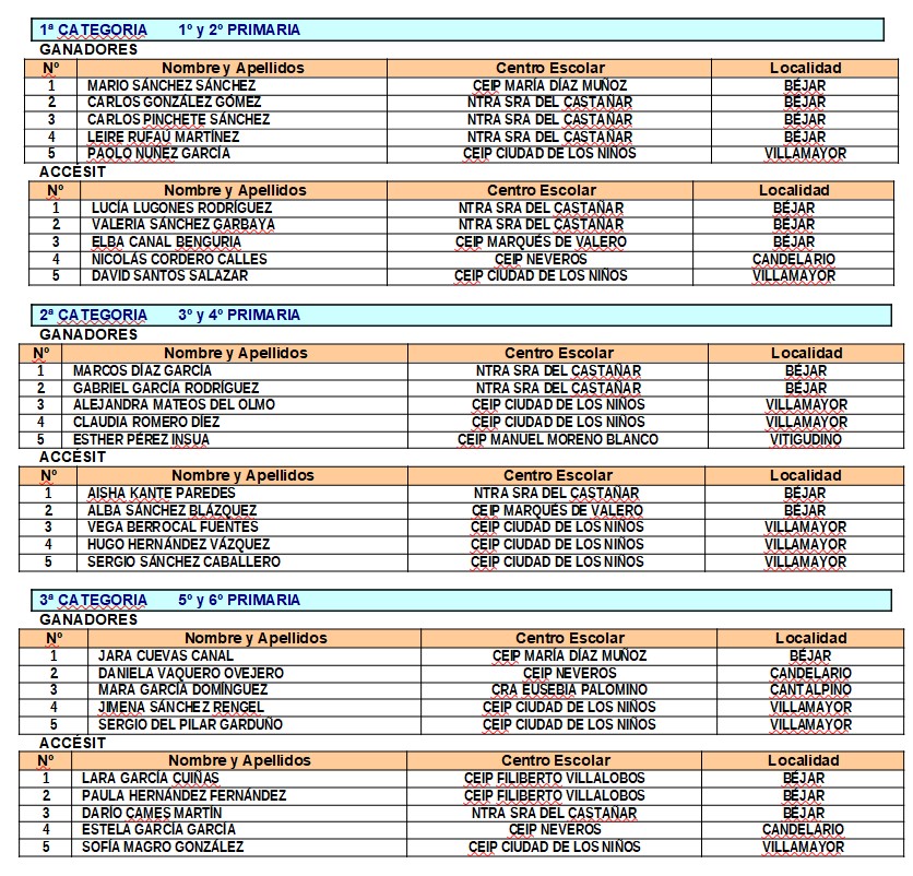 | 1 | MARIO SÁNCHEZ SÁNCHEZ | CEIP MARÍA DÍAZ MUÑOZ | BÉJAR |
