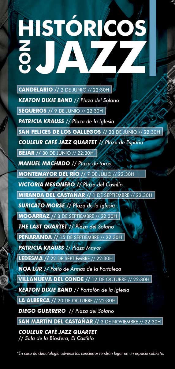 Béjar se encuentra dentro de la novedosa propuesta cultural “Históricos con jazz” que el Ayuntamiento de Béjar desarrolla conjuntamente con la Diputación de Salamanca y otros once municipios de la provincia desde junio hasta noviembre. El objetivo de este programa es incrementar y desestacionalizar el turismo disfrutando del patrimonio, la cultura y la gastronomía.