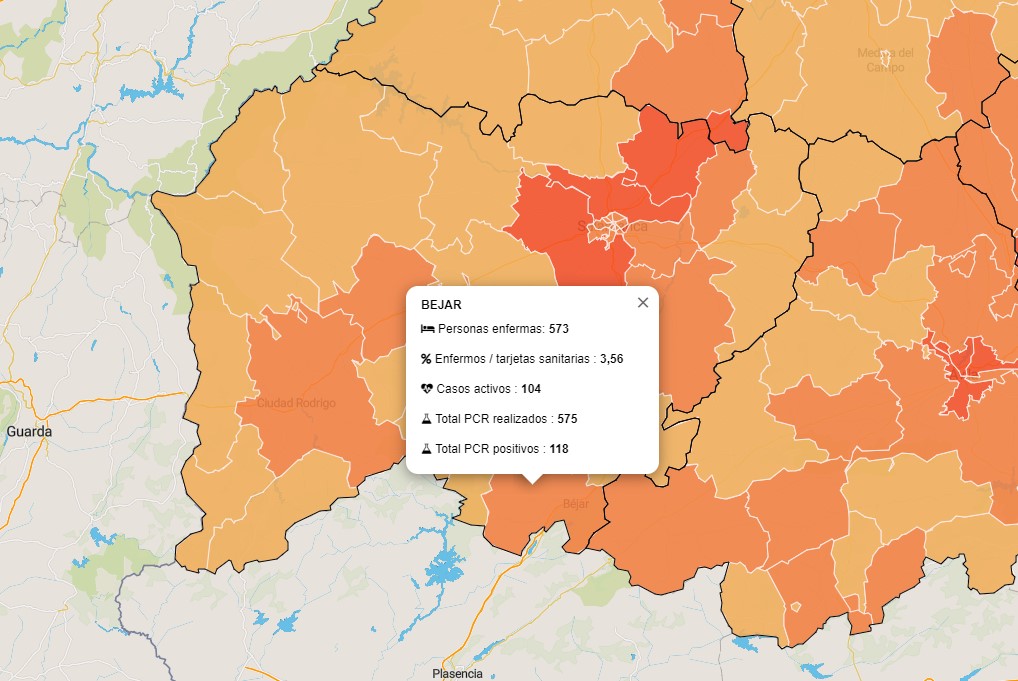 En lo referente a la zona de salud de Béjar, las 26 localidades que la conforman siguen registrando un mayor porcentaje de positivos que en el resto de la provincia. A fecha de hoy se registran, según datos de la Junta de Castilla y León, un total de 5 positivos por PCR en los últimos 7 días, sobrepasando el umbral del 3% de personas positivas por PCR por cada 10.000 tarjetas sanitarias. La zona de salud de Béjar, junto con la de Villoria y Linares de Riofrío son las únicas que se mantienen como "Zonas naranjas", antes denominadas "Zonas rojas", en la provincia de Salamanca.