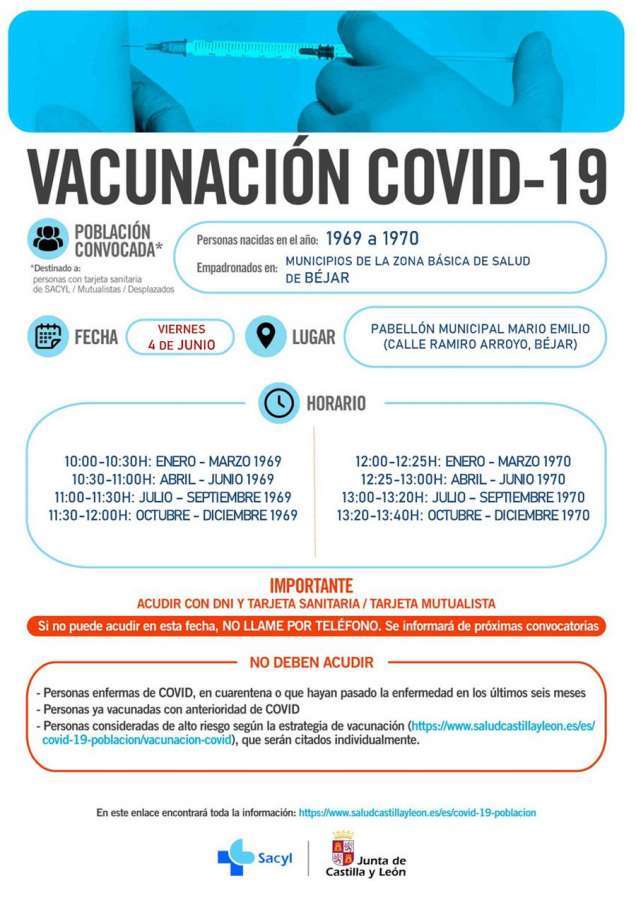 Continúa la campaña de vacunación contra la pandemia por la Covid-19. Este viernes, 4 de junio, desde el Sacyl se convoca a todos los ciudadanos pertenecientes a la Zona Básica de Salud de Béjar que hayan nacido en 1969 y 1970 para ser vacunados.