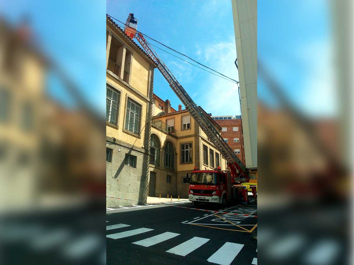 La Policía Local, alertada por una denuncia efectuada por los ciudadanos - que pudieron apreciar la situación desde el Hospital Virgen del Castañar, desde el que se aprecia el mal estado de la cubierta- llamaron a los bomberos, que están siendo los encargados de asegurar la zona, con la intervención del camión escala.