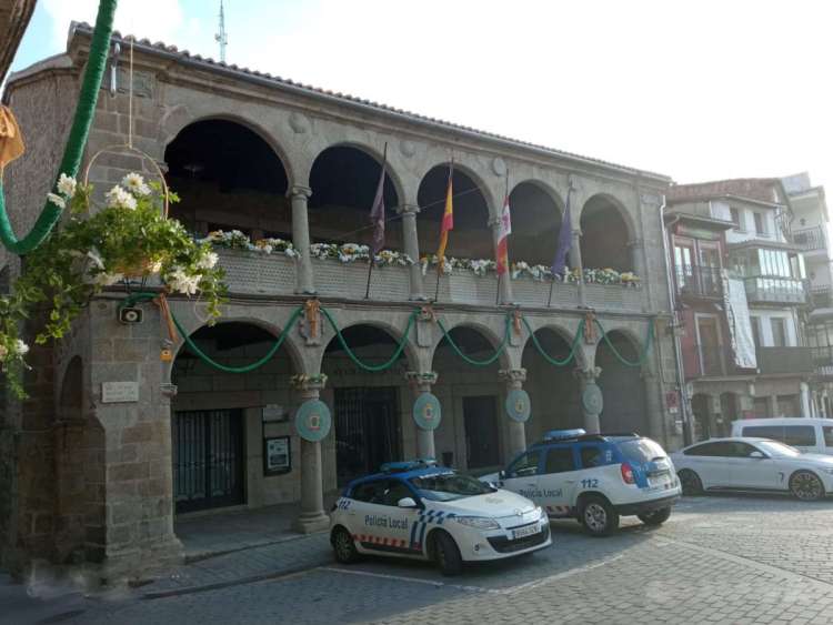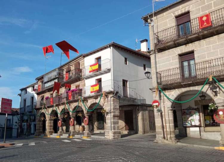 Hombres de Musgo y Maceros posaron frente al Ayuntamiento, en la Plaza Mayor, engalanada para la ocasión