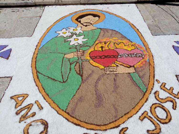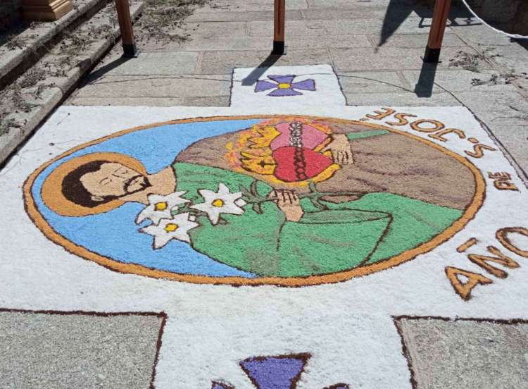 En este orden de cosas, la Cofradía de la Veracruz también quiso aportar su granito de arena ante la celebración “reducida” creando un mosaico dedicado a San José -en la celebración de su año- frente a la Torre de San Gil, en la Plaza de Nicomedes Martín Mateos.