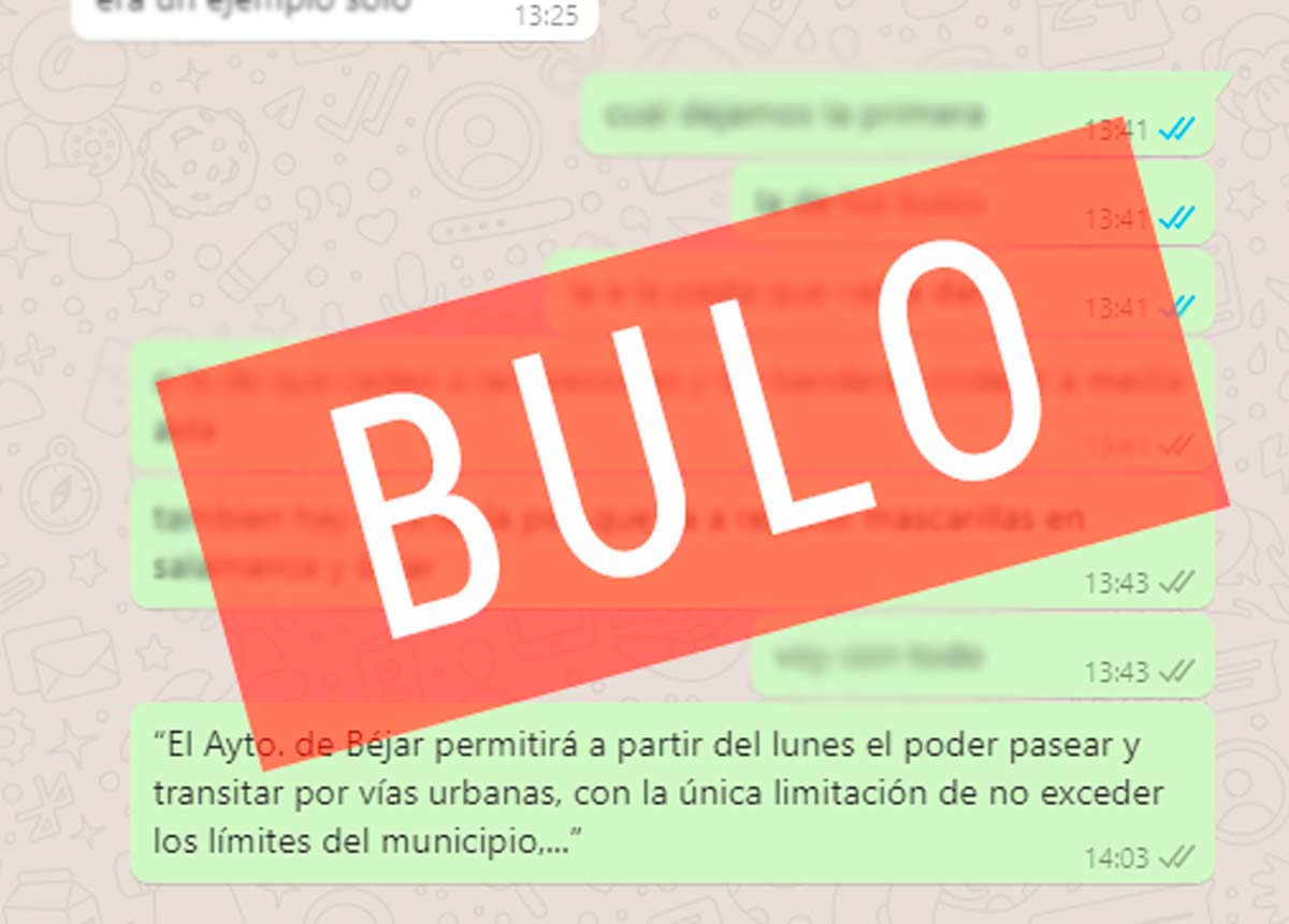 El Ayuntamiento de Béjar quiere advertir a la ciudadanía que hay un mensaje falso que está circulando por WhatsApp entre la población de Béjar y en el que se habla de permisos para pasear.