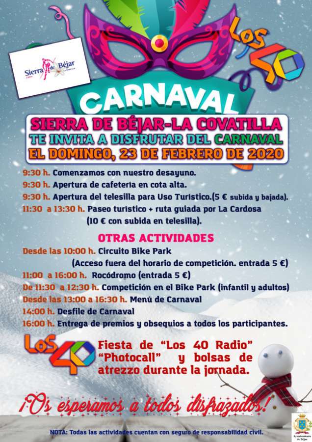 El domingo, será un día lleno de actividades y disfraces en La Covatilla, un día programado para todos los miembros de la familia con la fiesta de “Los 40”, que amenizará toda la jornada, apertura del telesilla, paseo turístico y ruta guiada, rocódromo, bike park, desfiles de carnaval, photocall, y en las cafeterías desayunos y comidas especiales con regalos y sorpresas.