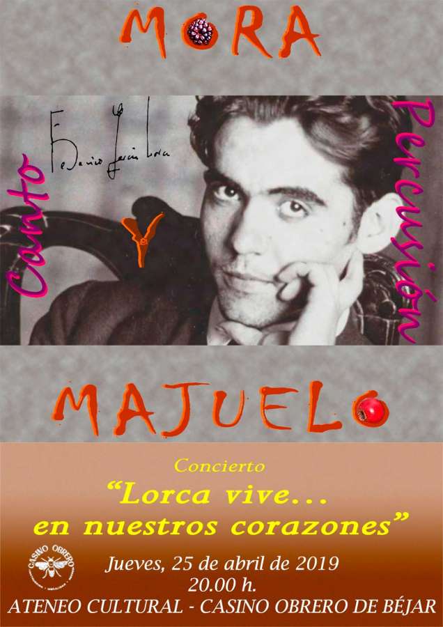 El Casino Obrero organiza bajo el título "Lorca vive en nuestros corazones”, el concierto de canto y percusión a cargo del grupo Mora y Majuelo. Tendrá lugar el próximo día 25 a partir de las 20 horas.