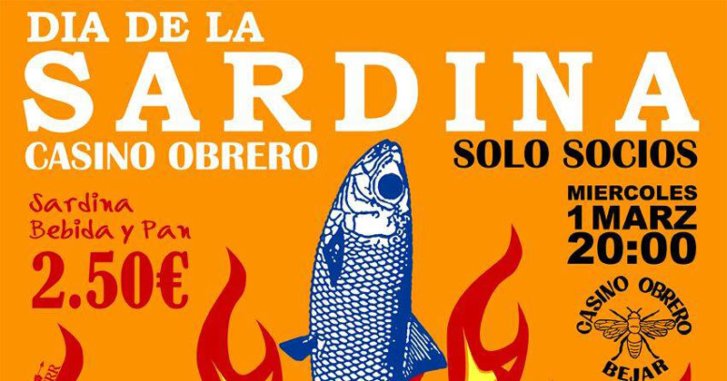 El Casino Obrero de Béjar celebra este miércoles 1 de Marzo el día de la sardina. El acto tendrá lugar en el Salón Principal del Ateneo a las 20:00 horas. La celebración es una actividad dirigida únicamente a los socios del Casino Obrero , que podrán disfrutar de la fiesta tradicional degustando el tradicional pescado, acompañado de bebida y pan por sólo 2.50 euros.