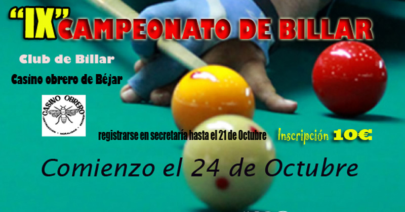 El Club de Ajedrez y Billar Casino Obrero de Béjar organiza el IX Torneo de Billar en la modalidad de Carambola a doble KO