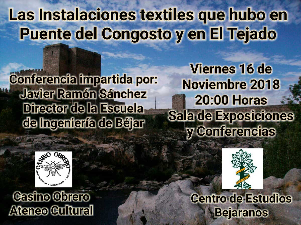 El próximo viernes día 16 a las 20 horas tendrá lugar en la Sala de Exposiciones y Conferencias del Ateneo Cultural Casino Obrero de Béjar una conferencia impartida por el director de la Escuela de Ingeniería de Béjar Javier Ramón Sánchez bajo el título "Las instalaciones textiles que hubo en Puente del Congosto y en El Tejado"