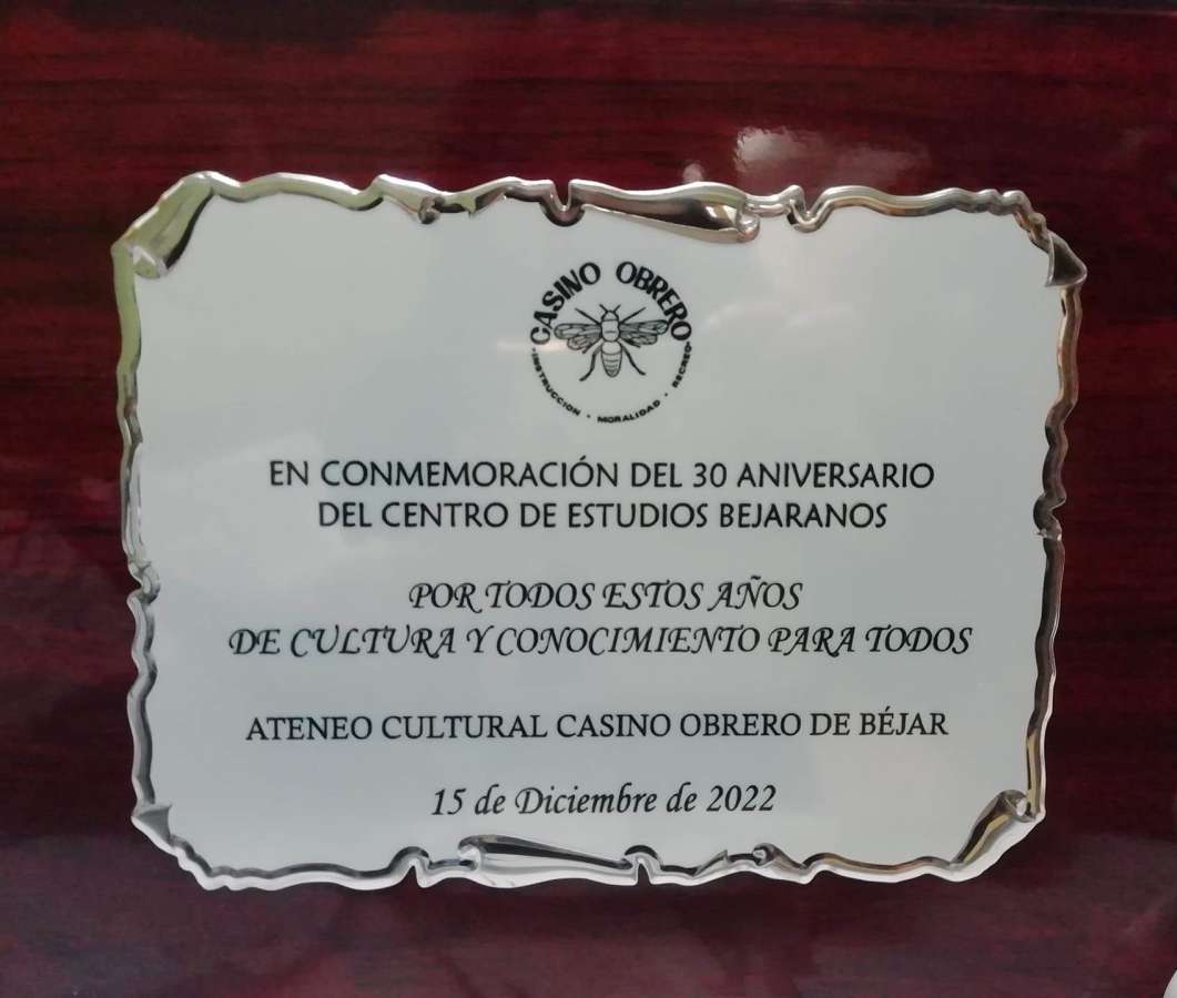 Después el presidente del Casino, Iván Parro Fernández, se refirió, ante los asitentes al acto, al hermanamiento que existe entre las dos instituciones culturales y apeló a los miembros del CEB a colaborar con ellos para que el ateneo cultural no desaparezca ante estos graves momentos de crisis de socios. Después hizo entrega de una placa conmemorativa en la que se puede leer: “En conmemoración del 30 aniversario del Centro de Estudios Bejaranos. Por todos estos años de cultura y conocimiento para todos. Ateneo Cultural Casino Obrero de Béjar, 15 de diciembre de 2022”.