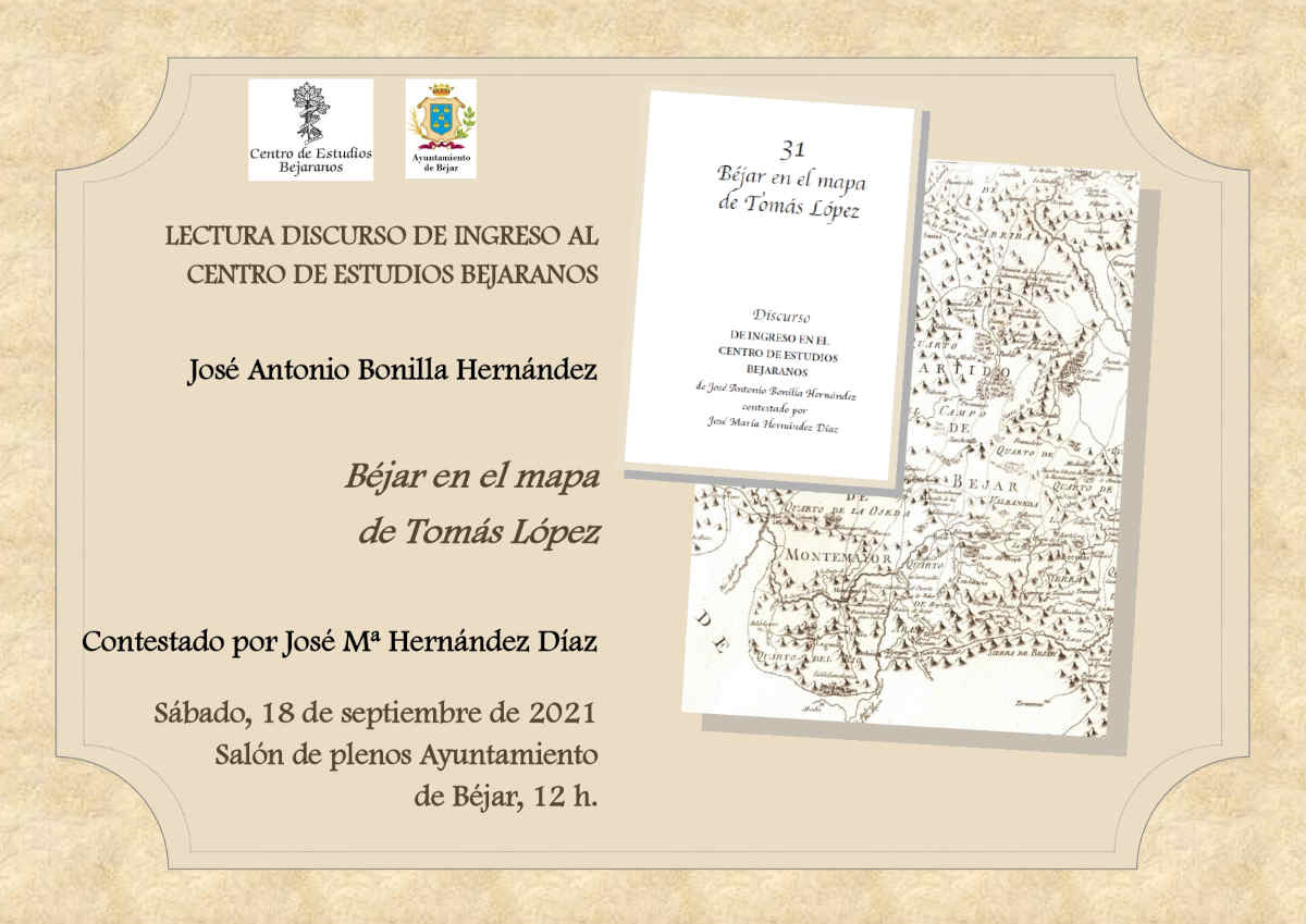 El próximo sábado 18 de septiembre a las 12 horas en el Salón de Plenos del Ayuntamiento de Béjar tendrá lugar la lectura de ingreso al Centro de Estudios Bejaranos de José Antonio Bonilla Hernández. El trabajo bajo el título "Béjar en el mapa de Tomás López", será contestado por José María Hernández Díaz.