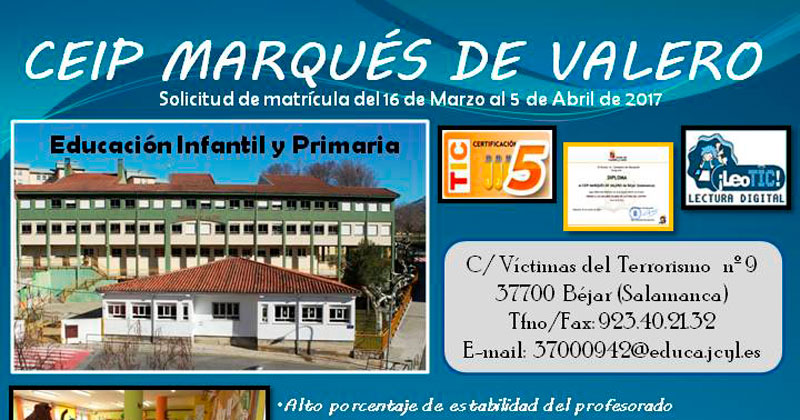 La próxima semana el CEIP Marqués de Valero celebrará sus jornadas de puertas abiertas para todas aquellas familias que estén interesadas en conocer los proyectos, el funcionamiento y organización, así como las aulas, dependencias y resto de instalaciones de los edificios de Educación Infantil y Educación Primaria del colegio público. Además se darán orientaciones y toda la información y documentación necesaria para el proceso de admisión que se desarrollará del 16 de marzo al 5 de abril de 2017.