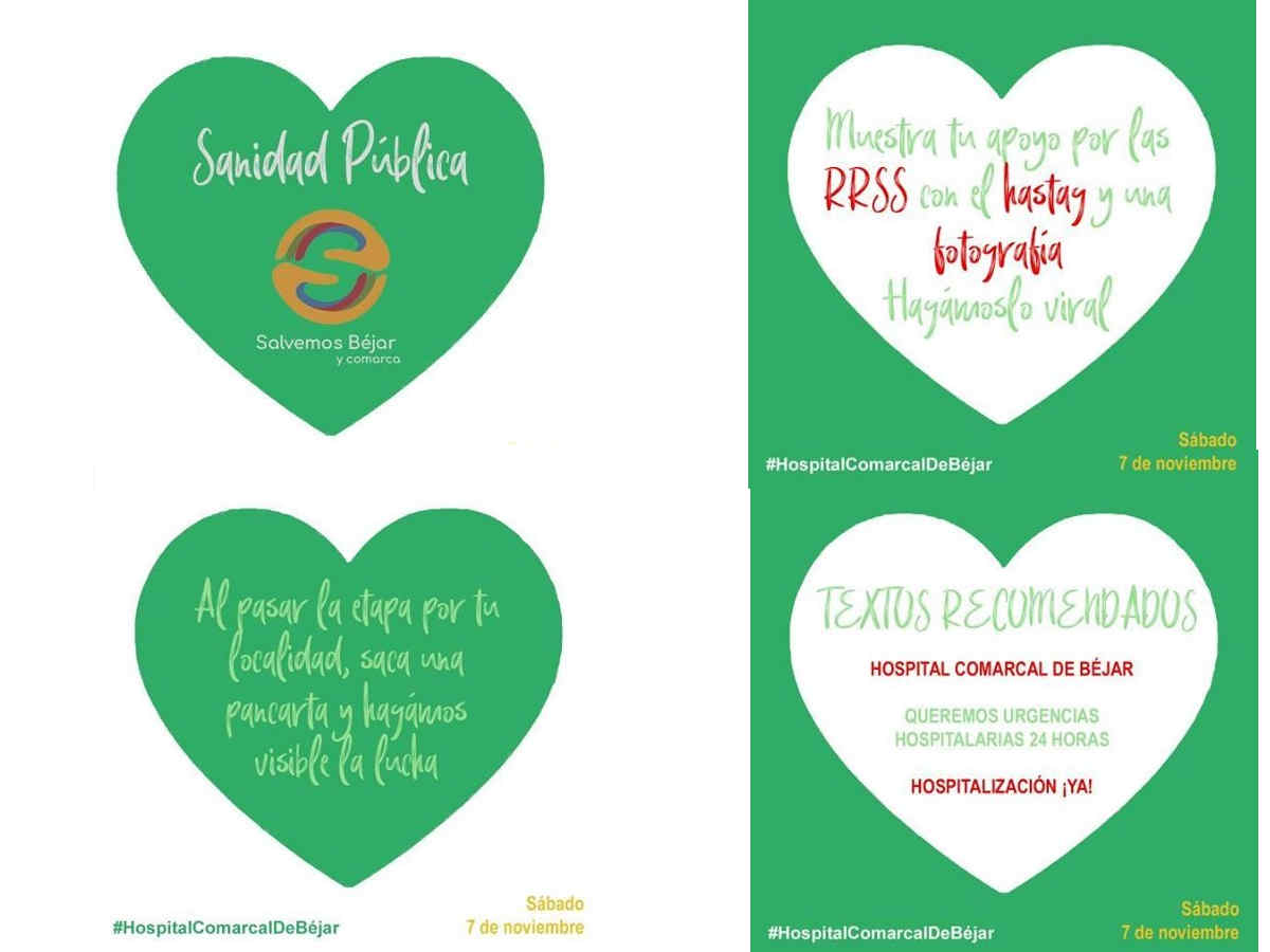 Además de invitar a sacar las pancartas a la calle e instar a hacer lo propio a los Ayuntamientos de Candelario y Béjar para que reivindicasen el regreso de las urgencias 24 horas y la hospitalización a Béjar, el colectivo Salvemos Béjar promueve una campaña en redes sociales para que los usuarios muestren su apoyo al Hospital de Béjar.
