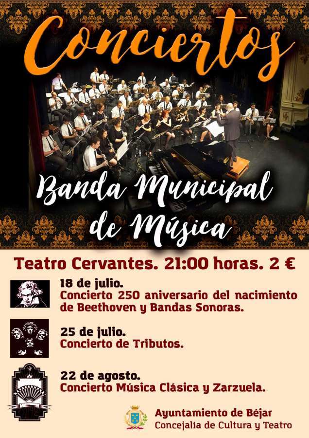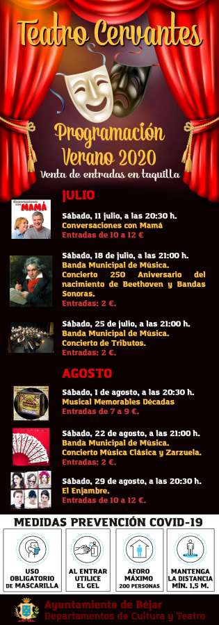 La concejalía de Cultura del Ayuntamiento de Béjar ha puesto en marcha la programación de verano en el Teatro Cervantes con comedias, musicales y conciertos de la Banda Municipal de Música los sábados del mes de julio y agosto.
