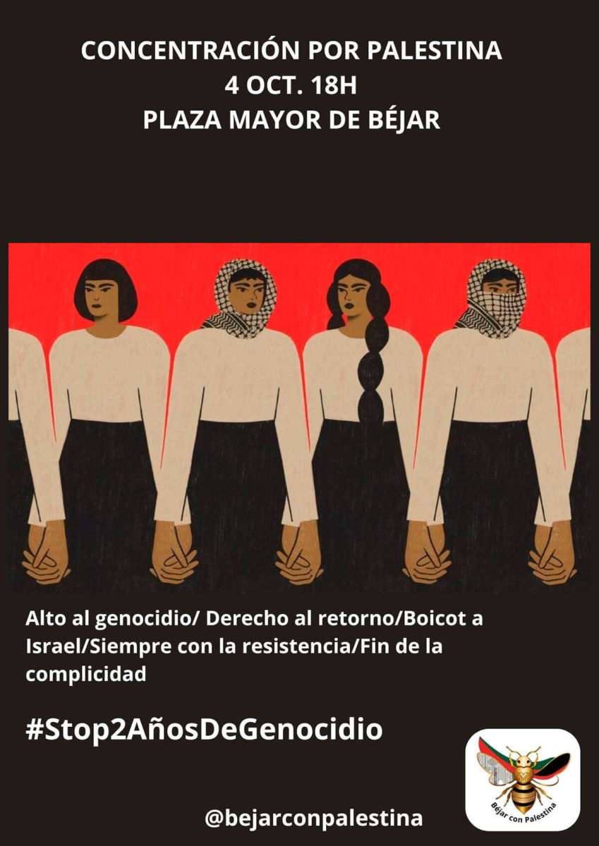El grupo Béjar con Palestina ha convocado una concentración el próximo viernes 4 de octubre a las 18:00 horas en la Plaza Mayor de Béjar, como muestra de solidaridad con el pueblo palestino y en protesta por la situación humanitaria en la Franja de Gaza.