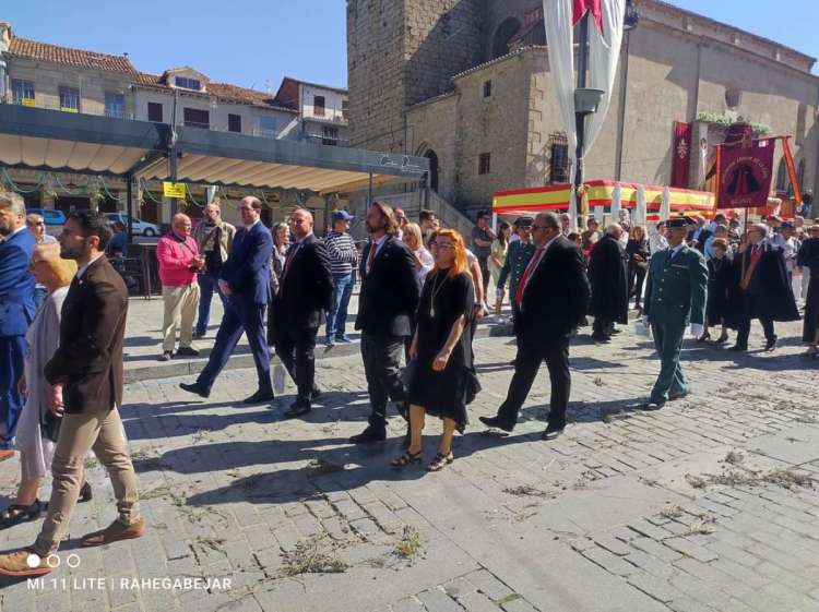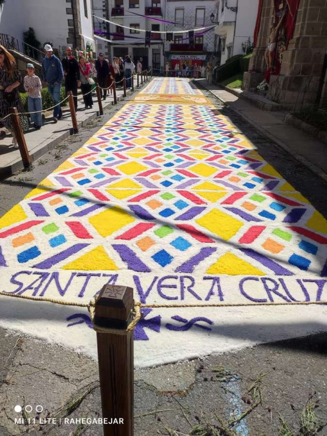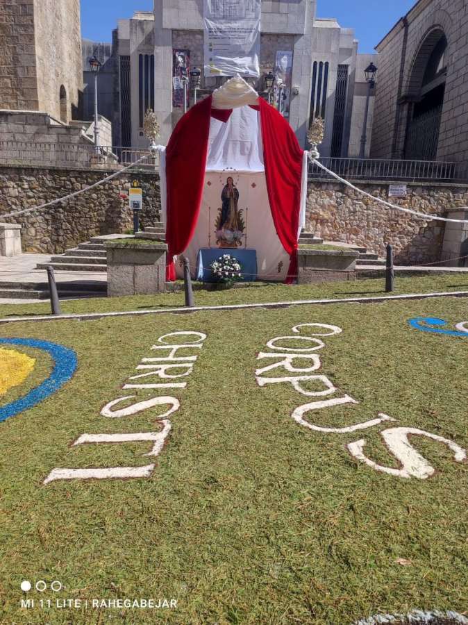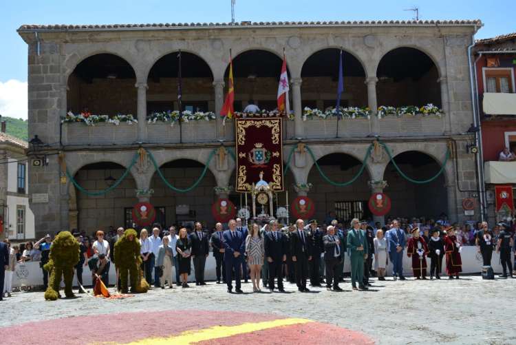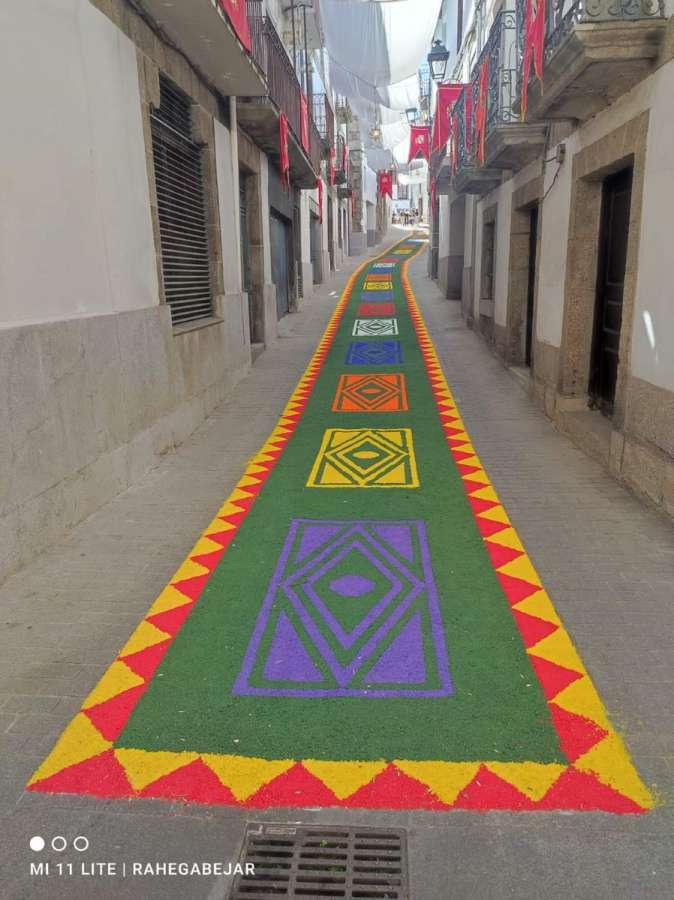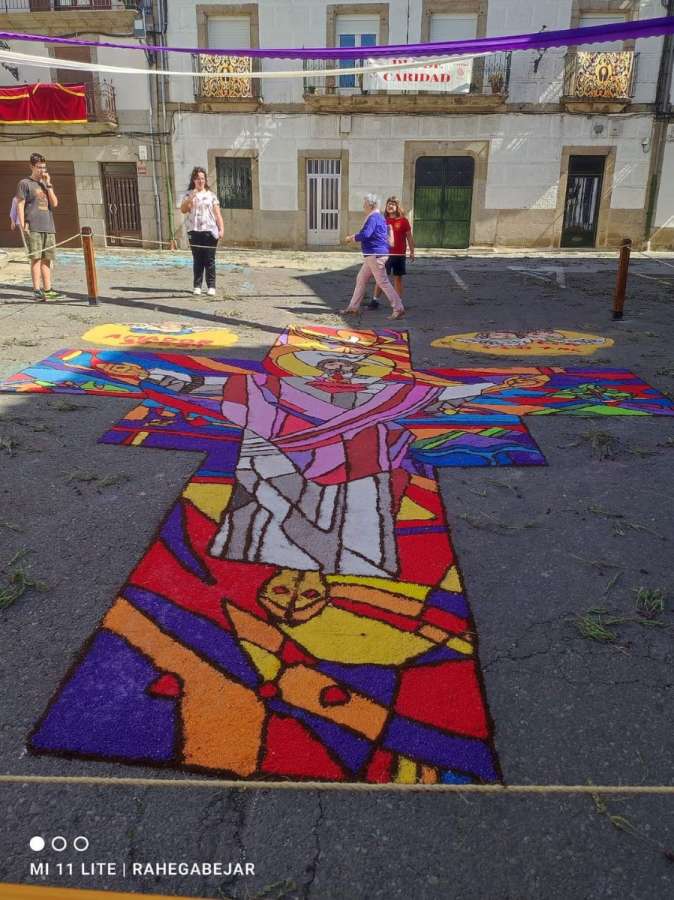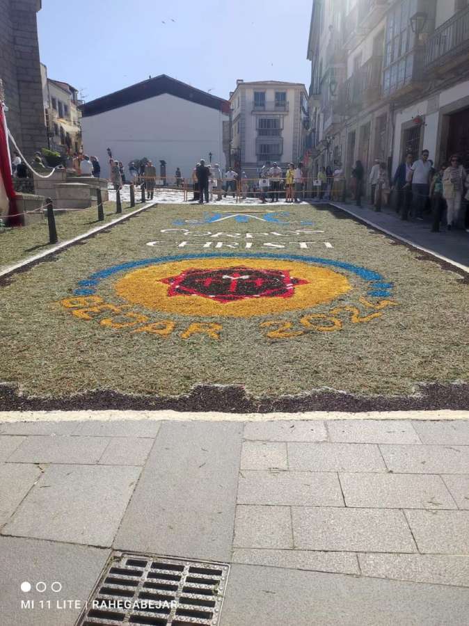 El recorrido prosiguió por Masilla, la calle Olleros y la plaza de la Piedad, donde se encontraba la alfombra elaborada por el colegio Nuestra Señora del Castañar. Finalmente, pasaron por la calle de Las Armas, con la alfombra de sal realizada por el Ayuntamiento, para terminar en la Plaza Mayor con la rendición de las banderas y estandartes.