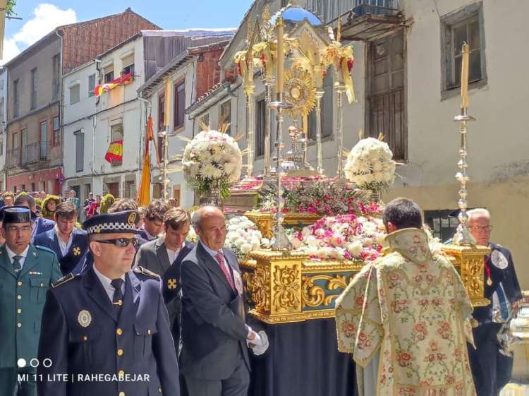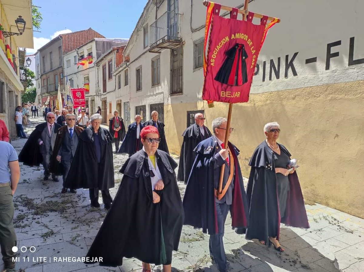 La procesión inició su marcha después de la Eucaristía en la Iglesia de Santa María, presidida por el párroco, Félix Pérez. Desde allí, toda la comitiva se desplazó hasta la Plaza Mayor, haciendo una parada en el altar de la Seráfica Hermandad. Continuaron por la calle Mayor y la plaza de Nicomedes Martín Mateos, donde la Hermandad de Jesús Nazareno rindió su bandera en honor al Santísimo. En la plaza del Solano, la Coral de Béjar cantaba mientras la procesión pasaba, para luego dirigirse a la Puerta de Ávila.