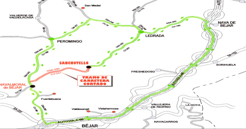 Con motivo de las obras que la Diputación de Salamanca promueve en la carretera CV-221 (DSA-250), en el tramo comprendido entre los municipios de Sanchotello y Navalmoral de Béjar, se hace necesario cerrar al tráfico de vehículos dicho tramo desde el lunes, 17 de noviembre, hasta el 15 de diciembre.