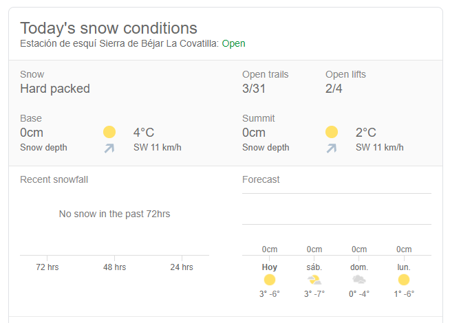 La estación de esquí Sierra de Béjar - La Covatilla se encuentra abierta con tres pistas verdes (pistas de debutantes) y a partir de mañana, sábado, tendrá abierto el remonte del telesilla y la pista azul de El Cerrojo, con un kilómetro y medio de longitud.